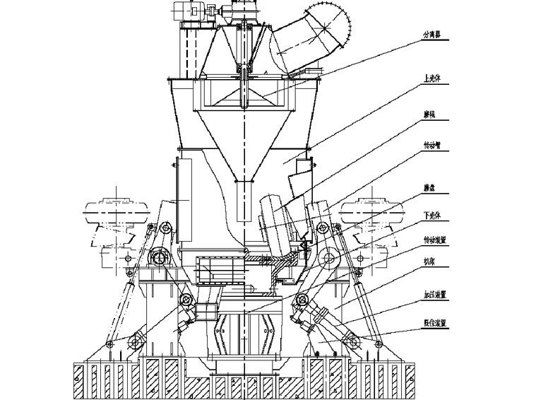 立磨機的主要結構由分離器、磨輥裝置、磨盤裝置、加壓裝置、減速機、電動機、殼體等部分組成。分離器是決定磨粉產品粗細的重要部件,它由可調速的傳動裝置、轉子、導向風葉、殼體、粗粉落料錐斗、出風口等組成,是一種高效、節能、快捷的選粉裝置。磨輥是對物料進行碾壓粉磨的主要部件、它被裝在磨機的彎臂上,在外力的作用下,緊壓在磨盤的物料上,在磨盤的帶動下,磨輥隨之轉到,從而使物料被碾壓而粉碎。磨盤固定在減速機的輸出軸上,磨盤上部為料床,料床上有環形槽,物料就是在環形槽內被磨輥碾碎的。加壓裝置時提供磨輥碾磨壓力的部件,它由高壓油站、液壓缸拉桿、蓄能器等組成,能向磨輥施加足夠的壓力使物料粉碎。減速機是傳遞動力的主要部件,磨盤的轉速就是減速機輸出抽的轉速。