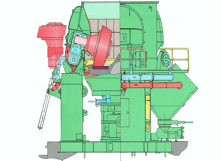 新型立磨主要由電動機、減速機、磨輥裝置、磨盤裝置、加壓裝置、選粉機、機體、油站、主機PLC電控系統等部分組成。主電機通過減速機帶動磨盤轉動,同時風從進風口進入立磨機體內,物料經螺旋給料機下料口落在磨盤中央,在離心力的作用下,物料從磨盤中央向邊緣均勻移動,經過磨盤上的粉磨輥道區域時,受到磨輥的碾壓,大塊物料直接被壓碎,細粒物料受擠壓后形成料床進行粒間粉碎。
