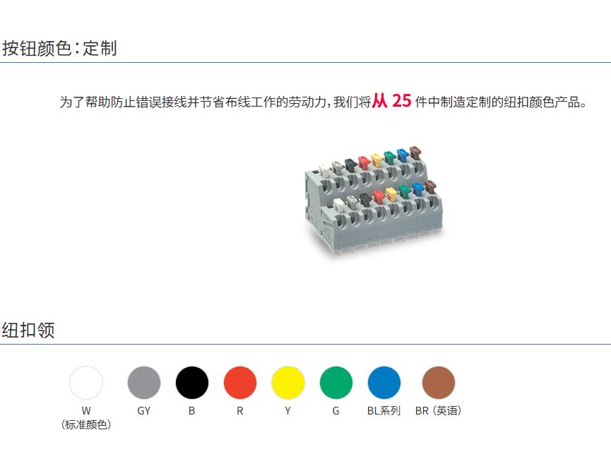 為了幫助防止錯誤接線并節省布線工作的勞動力,我們將從 25 件中制造定制的紐扣顏色產品。